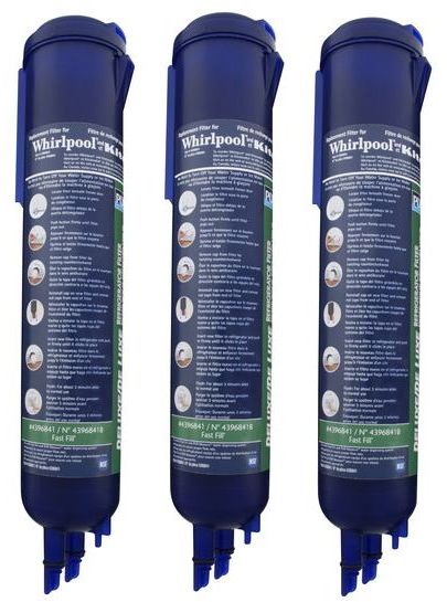 This PuR® Fast-Fill Refrigerator Water Filter is used in Whirlpool®, KitchenAid®, Maytag®, Amana®, and JennAir® Fast-Fill side-by-side refrigerators with filter access in the base grille. Simply press the release button to remove and replace the filter. This NSF® Certified filter reduces chlorine taste and odor, particulates (class I), lead, and mercury. Replace every 6 months ensures clean, safe drinking water. Contains 3 filters.